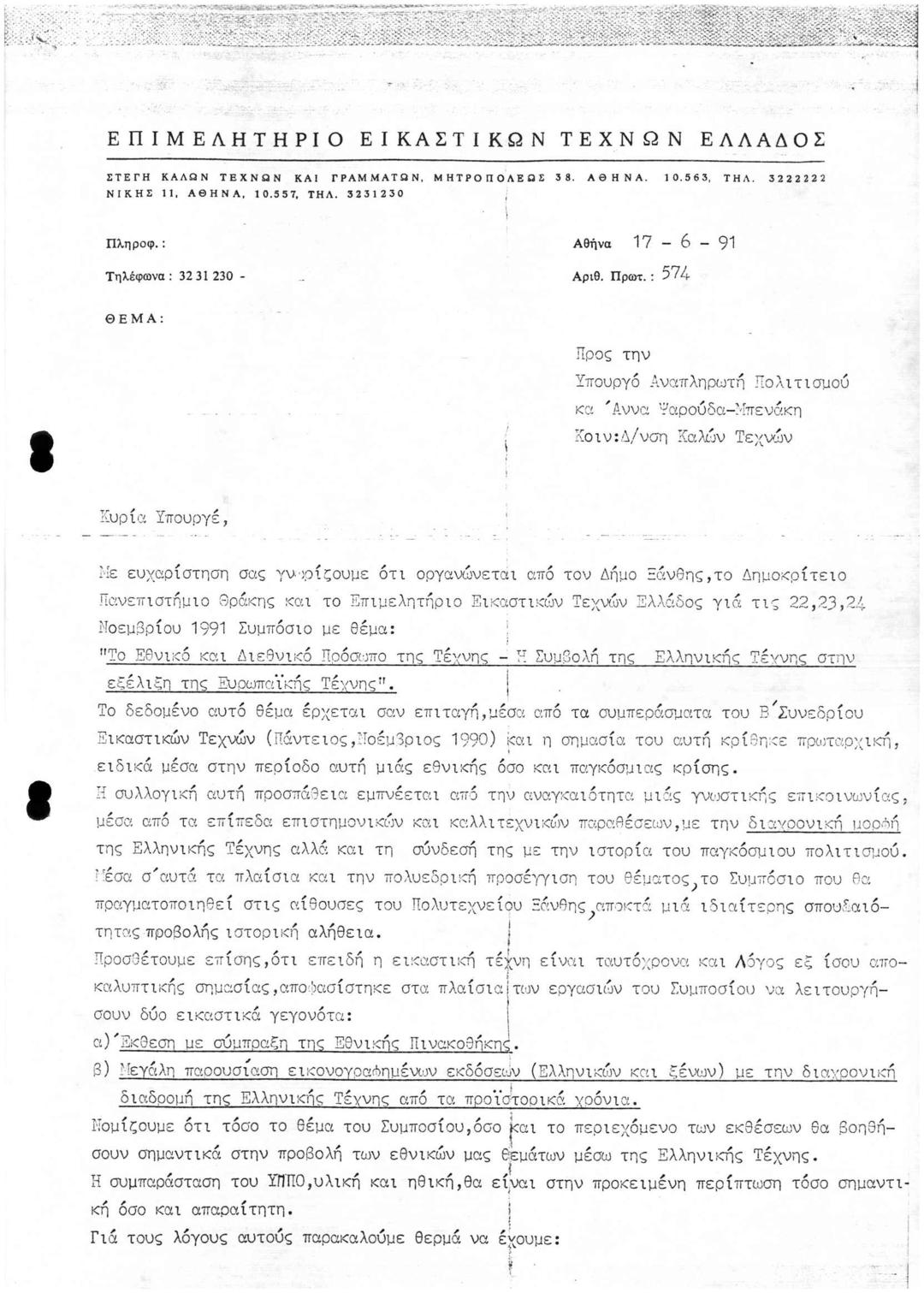 Επιστολή προς την Αν. Υπ. Πολιτισμού κ. Άννα Ψαρούδα Μπενάκη