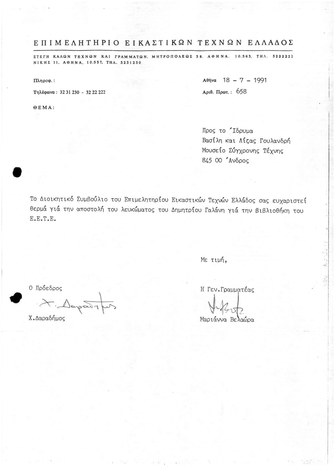 Επιστολή προς το Ϊδρυμα Βασίλη και Ελίζας Γουλανδρή
