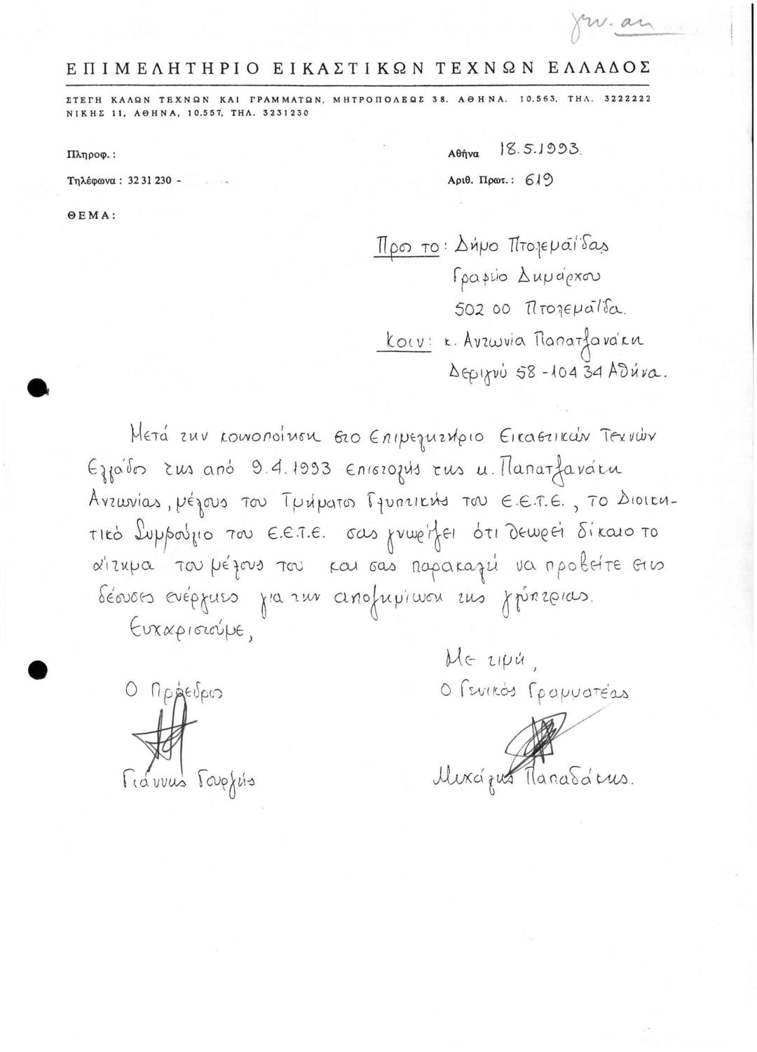 σχετικά με αποζημίωση γλύπτριας Α. Παπατζανάκη