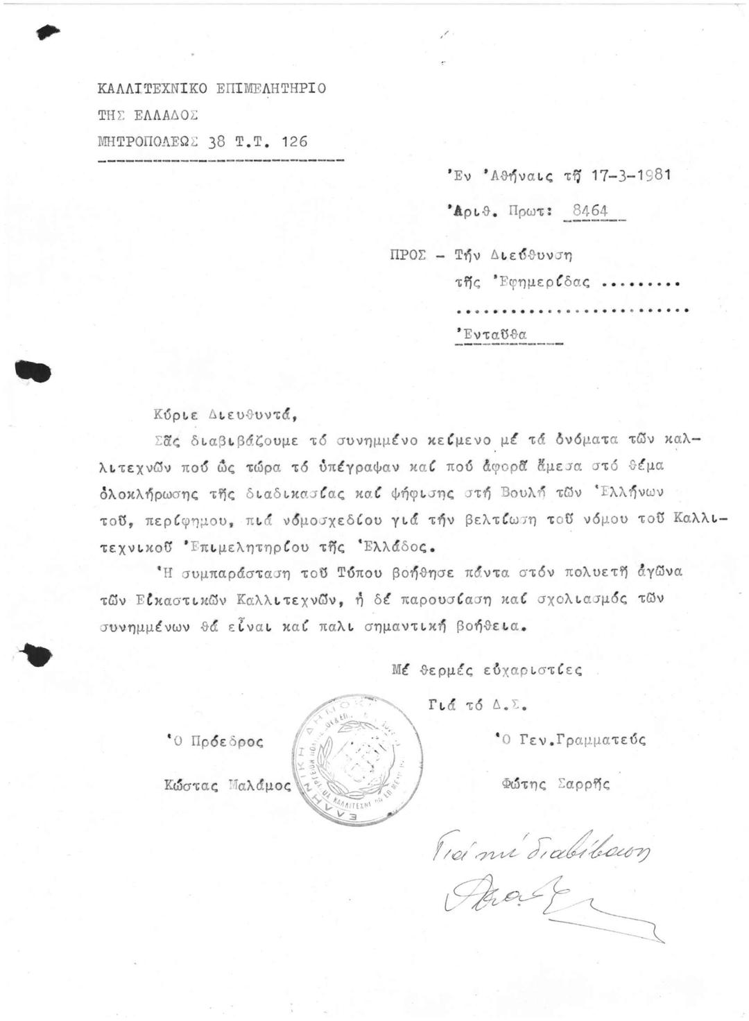 Διαβιβαστικό σχετικά με την βελτίωση του νόμου του Κ.Ε.Ε.