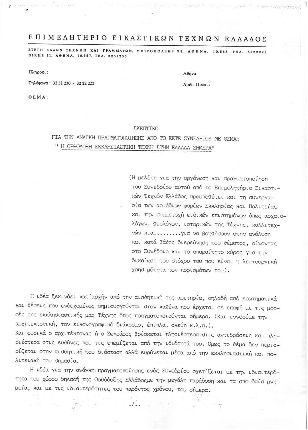 Σκεπτικό για την ανάγκη πραγματοποίησης από το ΕΕΤΕ συνεδρίου με θέμα: Η ΟΡΘΟΔΟΞΗ ΕΚΚΛΗΣΙΑΣΤΙΚΗ ΤΕΧΝΗ ΣΤΗΝ ΕΛΛΕΔΑ ΣΗΜΕΡΑ": Η ΟΡΘΟΔΟΞΗ ΕΚΚΛΗΣΙΑΣΤΙΚΗ ΤΕΧΝΗ ΣΤΗΝ ΕΛΛΑΔΑ ΣΗΜΕΡΑ
