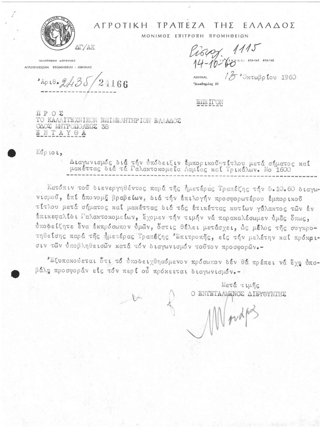 Διαγωνισμός για την Υπόδειξη Εμπορικού Τίτλου Σήματος και Μακέτας για τα Γαλακτοκομεία Λαμίας και Τρικάλων Νο 1600