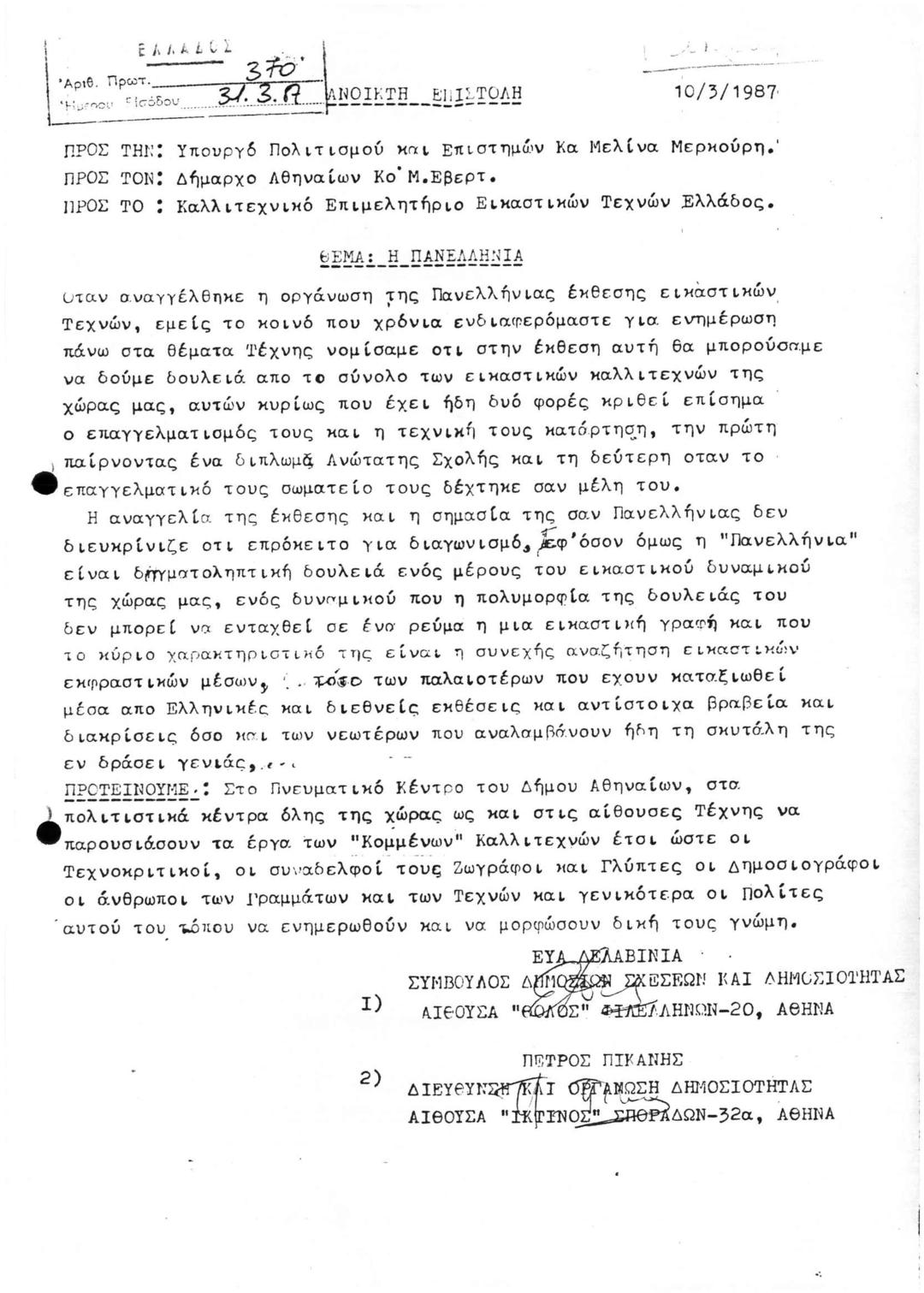 Πανελλήνια Έκθεση 1987/Ντοσιέ Π3: Προς την Υπουργό Πολιτισμού κα Μ. Μερκούρη