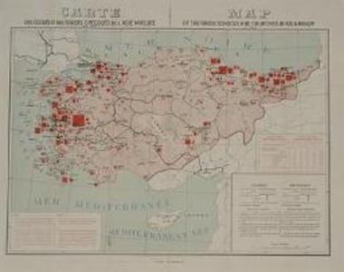 MAP OF THE GREEK SCHOOLS AND CHURCHES IN ASIA MINOR AT 1912 WITH TABLES AND STATISTICS"