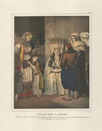 MARIAGE GREC A ATHENES. Pendant qu΄,un barbier Turc acheve la toilette de l΄epoux, la Mariee attend a la porte dans l΄interier de la cour, elle est entouree d΄amies et de curieux un jeune grec tient