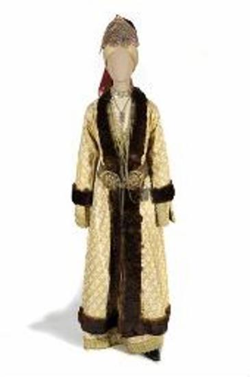 Ενδυμασία από τη Σίλλη Ικονίου, Μικρά Ασία. Αποτελείται από το λινομέταξο πουκάμισο, το φουστάνι από χρυσοϋφαντη στόφα, τη "σάλτα" (επενδύτης) από χρυσοϋφαντη στόφα διακοσμημένη με γούνα στα ανοίγματα. Στη μέση έχει ζώνη με πόρπη ενώ στο κεφάλι φοράει φέσι με χρυσοκεντημένα μαντίλια, 19ος αι.