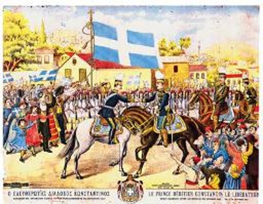 "Ο ΕΛΕΥΘΕΡΩΤΗΣ ΔΙΑΔΟΧΟς ΚΩΝΣΤΑΝΤΙΝΟΣ ΠΑΡΑΔΙΔΩΝ ΕΙΣ ΤΟΝ ΒΑΣΙΛΕΑ ΠΑΤΕΡΑ ΤΟΥ ΤΗΝ ΘΕΣΣΑΛΟΝΙΚΗΝ ΤΗ 29η ΟΚΤΩΒΡΙΟΥ 1912 LE PRINCE HERITIER CONSTANTIN LE LIBERTEUR REMET SALONIQUE ENTRE LES MAINS DU ROI GEORG"