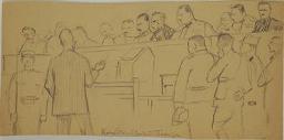 Σκίτσο από τη Δίκη των Έξι, κατάθεση στρατηγού Παπούλα