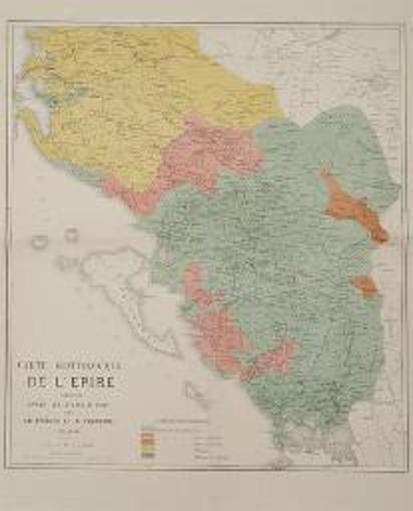 "CARTE GLOTTOLOGIQUE DE L' EPIRE". Γλωσσολογικός χάρτης της Β. Ηπείρου σχεδιασμένος από τον Ν. Φουντούλη και τυπωμένος στο λιθογραφείο του G. Kohlmann, Αθήνα 1880. Ο χάρτης έχει εκπονηθεί από τον Ζίγκμουντ Μινέικο.
