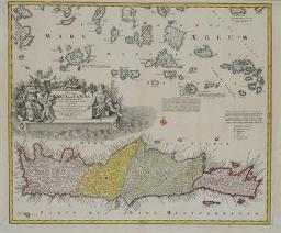 INSULA CRETA hodie CANDIA in sua IV. TERRITORIA divisa cum adjacentibus AEgei Maris Insulis ac praesertim nuperrime ex abysso pelagi emergente. NOVA SANTORINI INSULA occasione cuius tam stupendi Natu