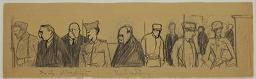 Σκίτσο από τη Δίκη των Έξι, Στράτος, Μπαλτατζής, Πρωτοπαπαδάκης