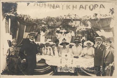 The stand of the Athenian Market at an international bazaar (?) probably in Smyrna. Men and scouts surround the ladies at the stand. (EN)