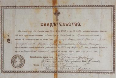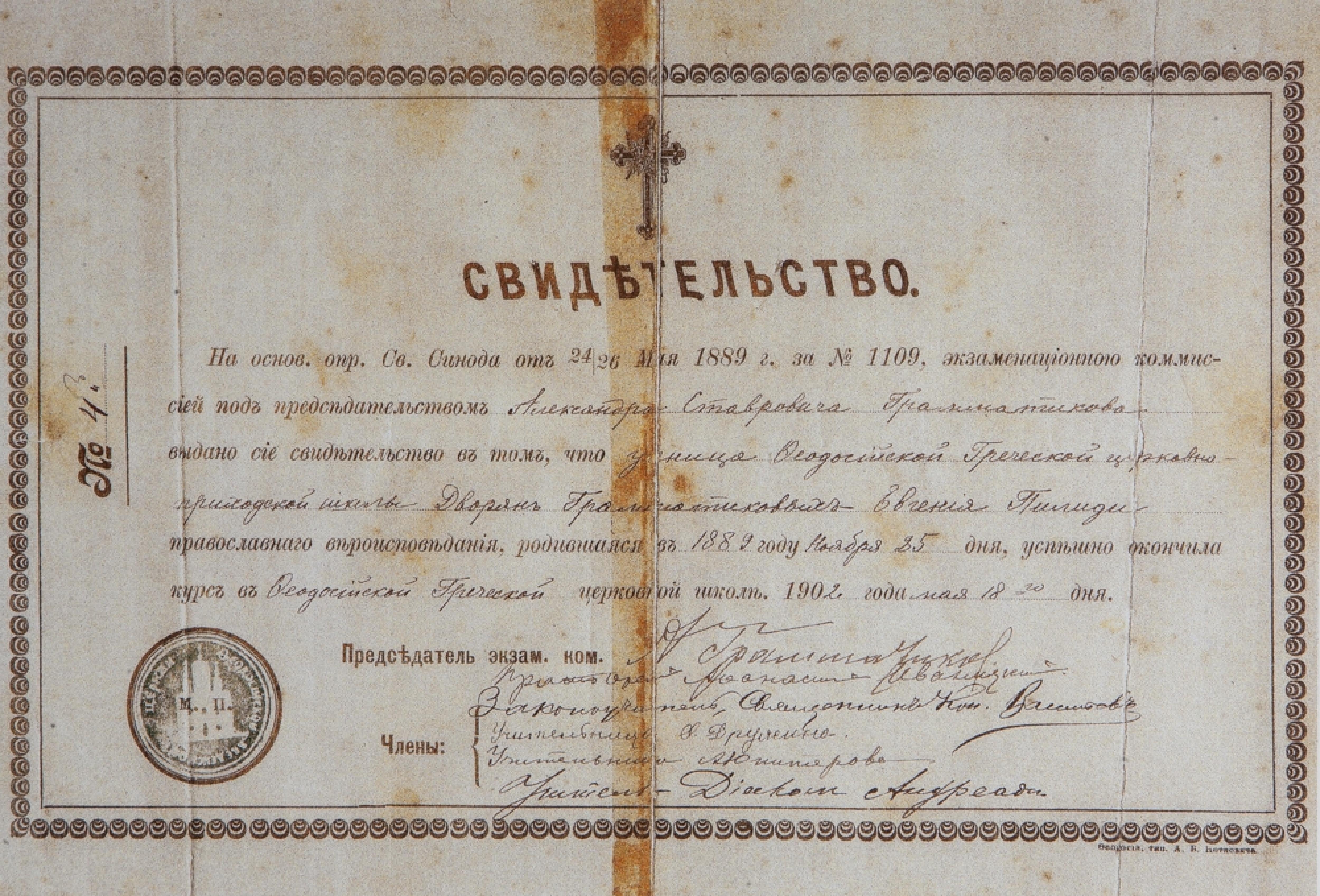 Απολυτήριο Γραμματικωβείου Εκκλησιαστικής Σχολής Θεοδοσίας Κριμαίας της Ευγενίας Δημ. Πηλείδου