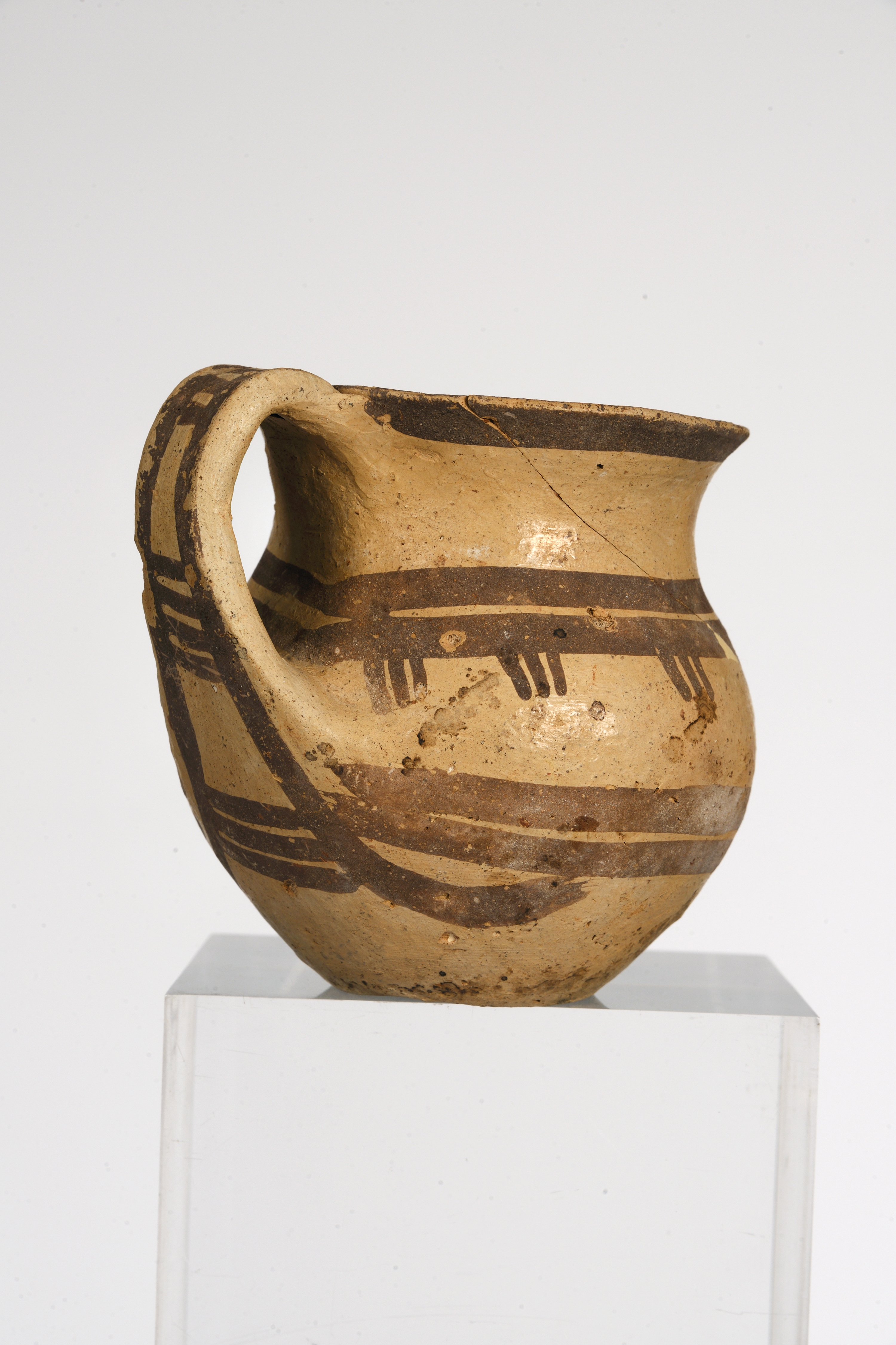 Πήλινη ευρύστομη πρόχους. Σφαιρικό σώμα με επιπεδωμένη βάση, υψηλό έξω νεύον χείλος. Φέρει πλατιά ταινιόσχημη λαβή. Διακόσμηση: Στην κοιλιά του αγγείου δύο παράλληλες ταινίες περιτρέχουν το σώμα απολήγοντας στο κάτω μέρος της λαβής. Στον ώμο του αγγείου δύο παράλληλες ταινίες, η κατώτερη των οποίων φέρει στο κάτω μέρος ανά διαστήματα διαγώνιες κάθετες γραμμώσεις (τρεις των τριών γραμμών, τέσσερις των τεσσάρων, μία των πέντε) καστανή ταινία, επίσης περιτρέχει την εξωτερική πλευρά του χείλους. Στην εσωτερική τρεις συστάδες των πέντε γραμμών, μια των οχτών, λείπει μεγάλο τμήμα από το χείλος. Στην πάνω επιφάνεια της λαβής, καστανές ταινίες περιτρέχουν τα άκρα φτάνοντας το κάτω μέρος του αγγείου "ανοίγοντας" αντιδιαμετρικά (τοξοειδώς). Ενώνονται από συστάδες οριζοντίων γραμμών (τέσσερις στην κορυφή), τέσσερις στο κέντρο, τρεις στο κάτω μέρος. Πηλός ωχροκίτρινος, λειαμένος, με μικρές προσμίξεις.