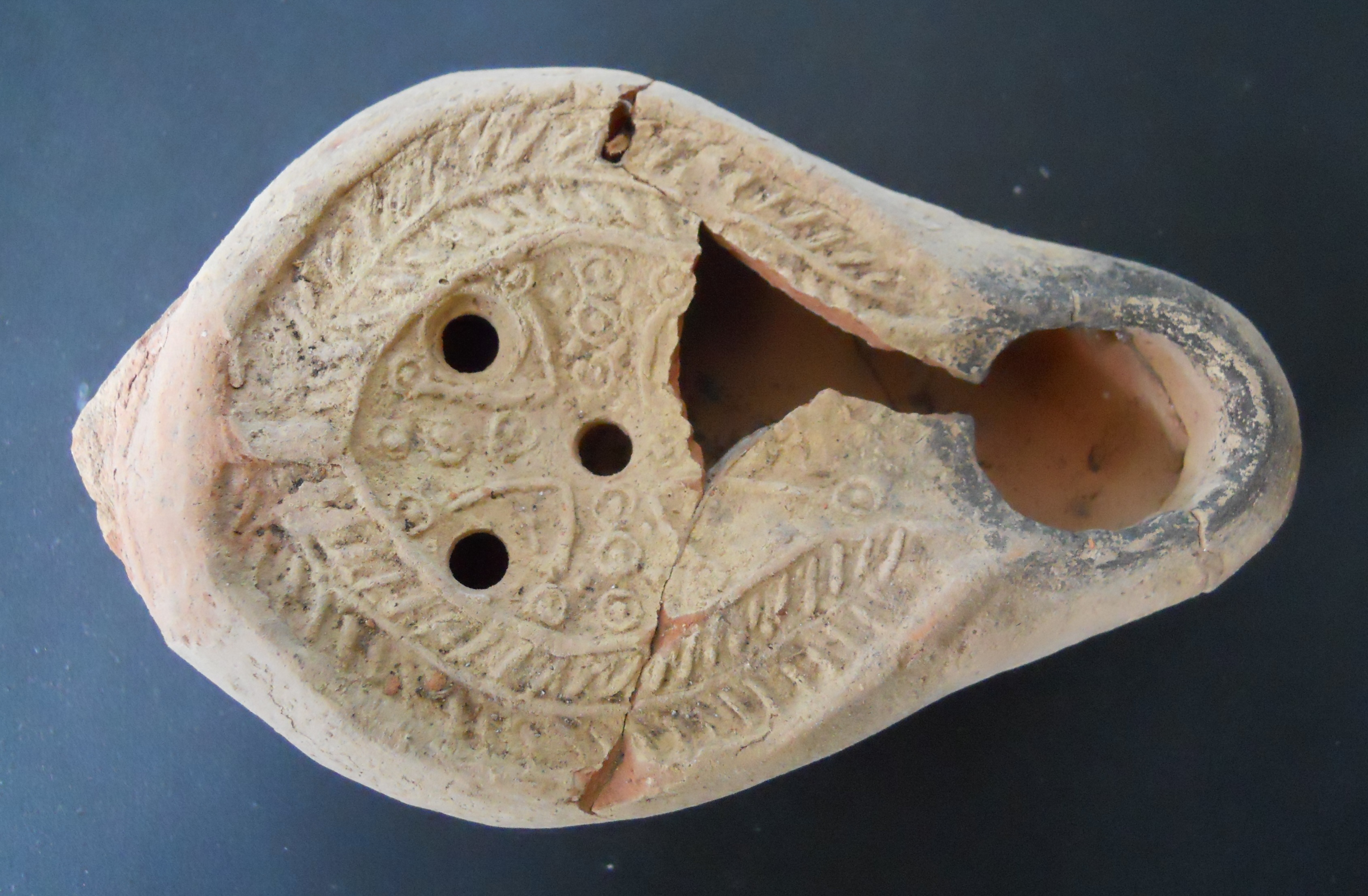 Πήλινος λύχνος"βορειοαφρικανικού τύπου". Στο δίσκο αποδίδεται ισοσκελής σταυρός με πεπλατυσμένες κέραιες. Τα διεθνούς ακτινοβολίας εργαστήρια κεραμικής της βόρειας Αφρικής (Τυνησία) άκμασαν από τον 2ο αι. μ. Χ. έως και τον 7ο. Τα προϊόντα τους εξάγονταν σε όλη τη Μεσόγειο αλλά και σε απομακρυσμένες περιοχές, όπως η Βρετανία. Την απήχηση, που είχαν τα αντικείμενα που προέρχονταν από τα παραπάνω εργαστήρια επιβεβαιώνει το γεγονός ότι τοπικά εργαστήρια του ελλαδικού και όχι μόνο χώρου αντέγραψαν όχι μόνο το σχήμα τους αλλά και τη διακόσμηση που έφεραν. Τέτοιου είδους αγγεία έχει επικρατήσει να αποκαλούνται " βορειοαφρικανικού τύπου".Οι λύχνοι από πηλό ή μέταλλο αποτελούσαν το κύριο μέσο φωτισμού της περιόδου. Οι πήλινοι λύχνοι της Πρωτοβυζαντινής κυρίως περιόδου, διακοσμούνται με διάφορα γεωμετρικά και φυτικά θέματα καθώς και με θρησκευτικά σύμβολα. (EL)
