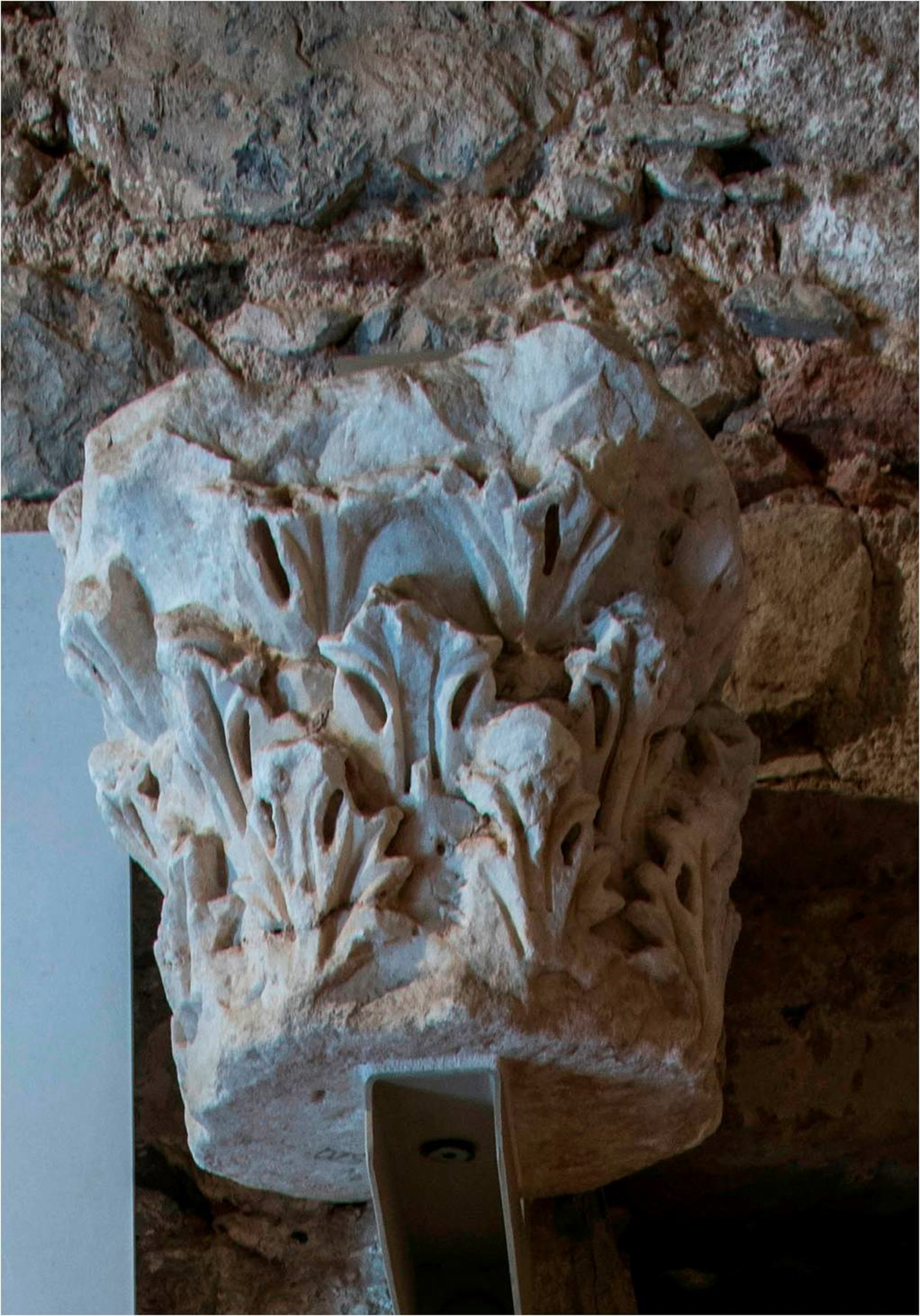 Επίκρανο παραστάδας. Στην πρόσθια όψη φέρει διακόσμηση από φύλλα πριονωτής άκανθας σε τρεις επάλληλες σειρές, λαξευμένα με αρκετή πλαστικότητα και χρήση τρυπάνου. Πίσω από τη διακοσμημένη, πρόσθια όψη, διαμορφώνεται σε κύβο. Στην άνω επιφάνεια φέρει εντορμία.