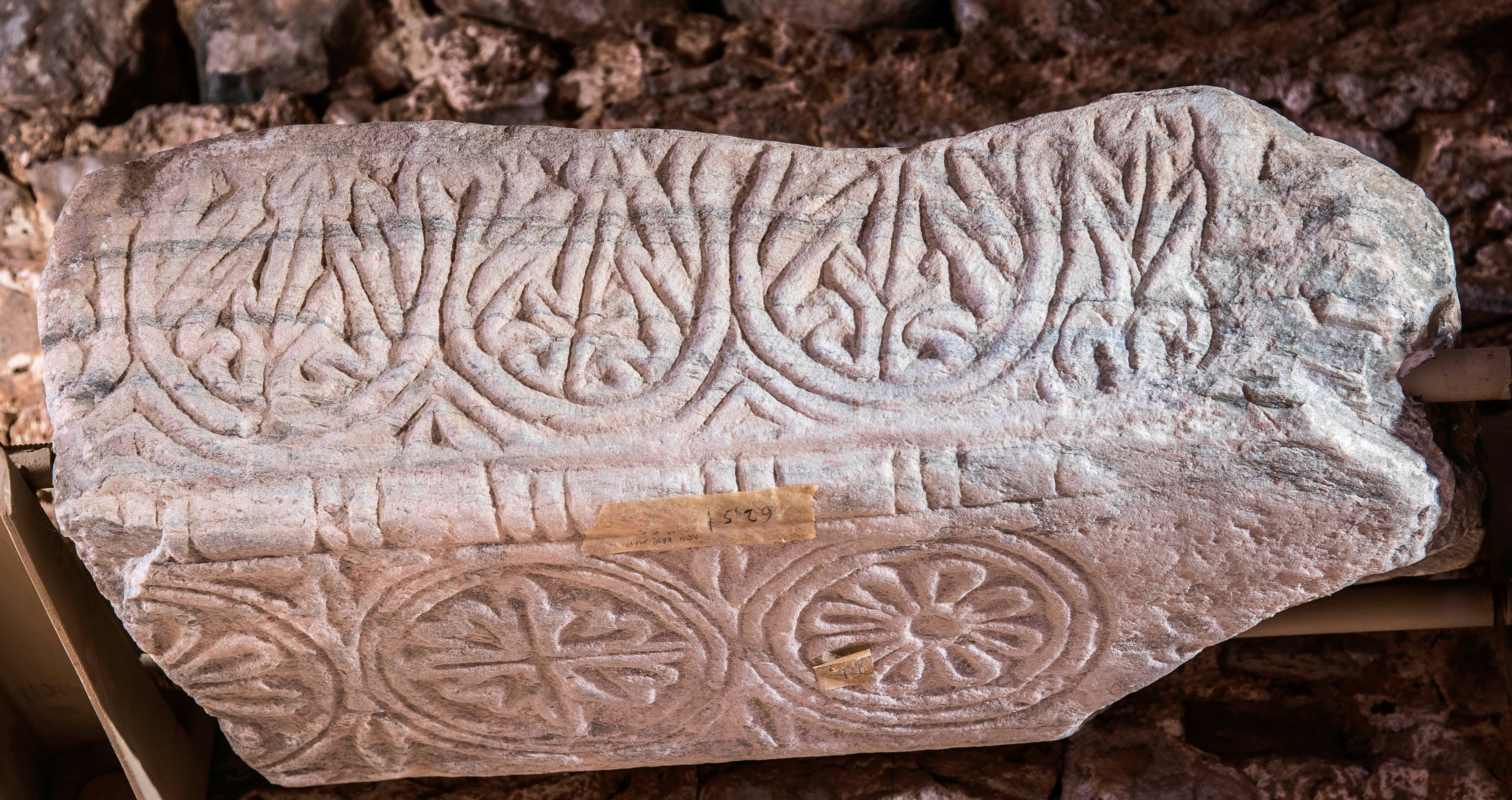 Τμήμα μαρμάρινου επιστυλίου. Η λοξότμητη πλευρά καλύπτεται με ζώνη λυροειδών, που περικλείουν σχηματοποιημένα ημίφυλλα άκανθας. Στην κάτω επιφάνεια αποδίδονται τρεις εφαπτόμενοι κύκλοι, οι οποίοι περιβάλλουν ρόδακες. Η ακμή κοσμείται με αστράγαλο.