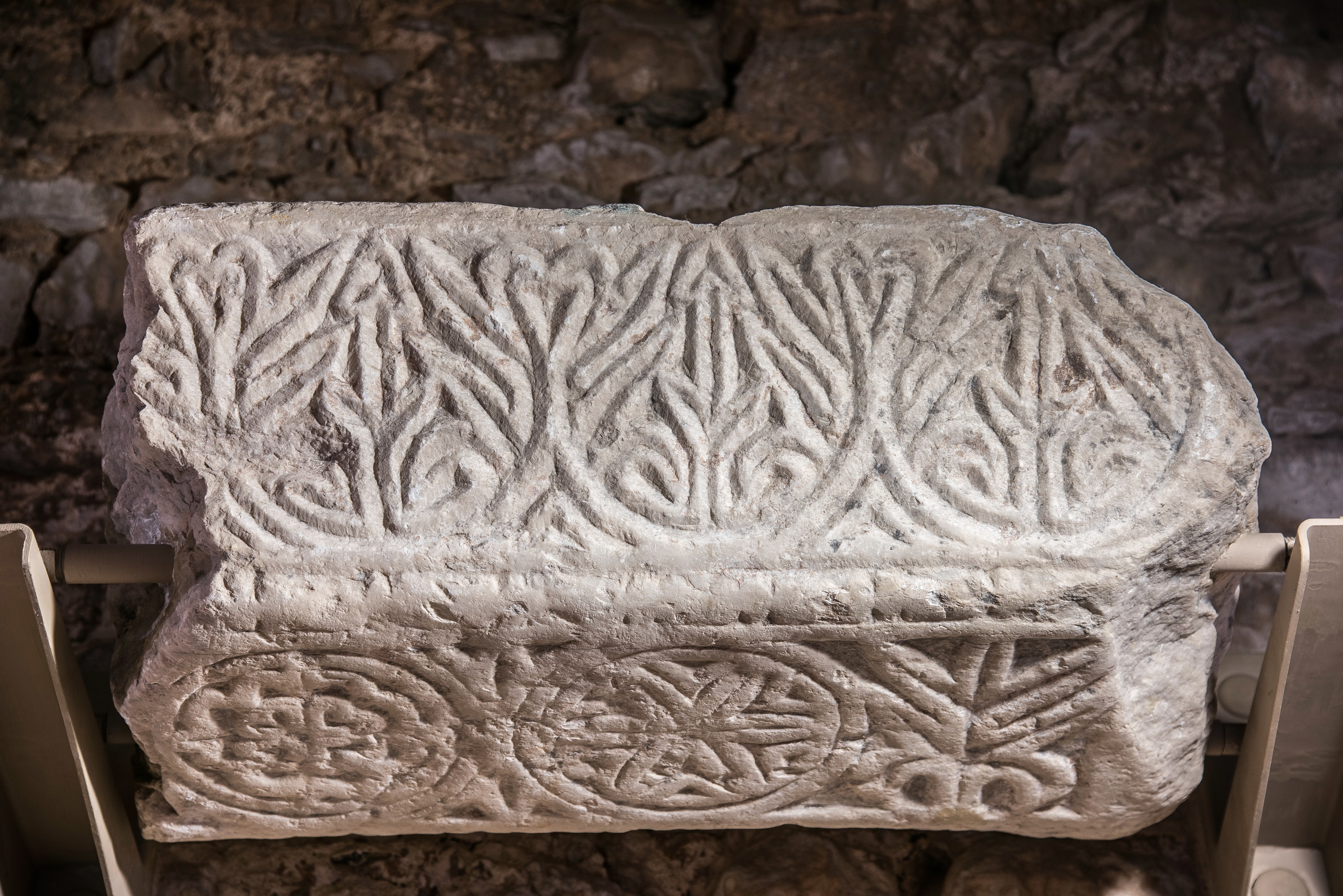 Τμήμα μαρμάρινου επιστυλίου. Η λοξότμητη πλευρά καλύπτεται με ζώνη λυροειδών, που περικλείουν σχηματοποιημένα ημίφυλλα άκανθας. Στην κάτω επιφάνεια ζώνη με άκανθα και δύο εφαπτόμενους κύκλους, οι οποίοι περιβάλλουν ρόδακες. Η ακμή κοσμείται με αστράγαλο.