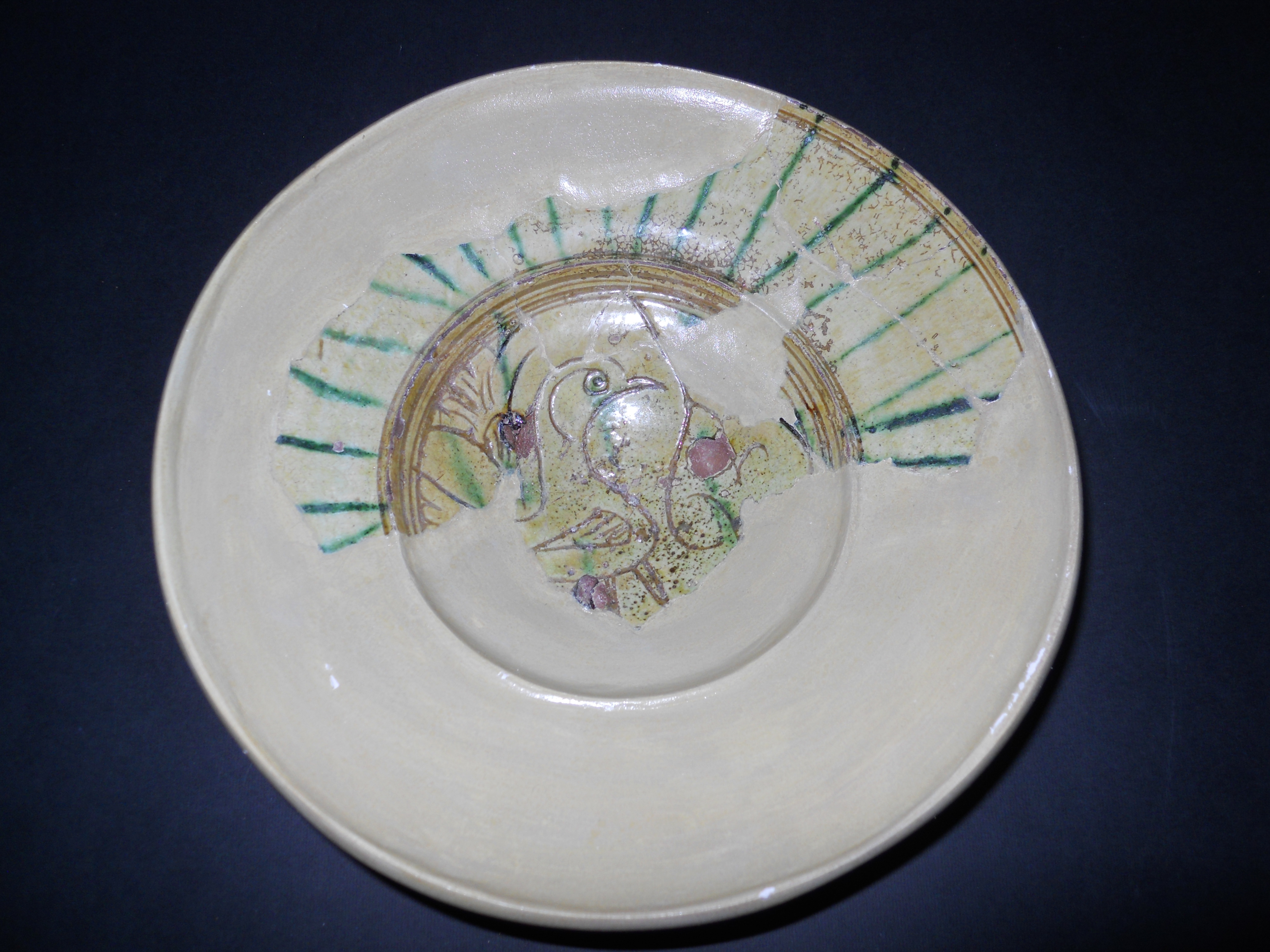 Πήλινο, εφυαλωμένο πινάκιο. Φέρει γραπτό διάκοσμο, ενώ στον πυθμένα αποδίδεται εγχάρακτο πτηνό.