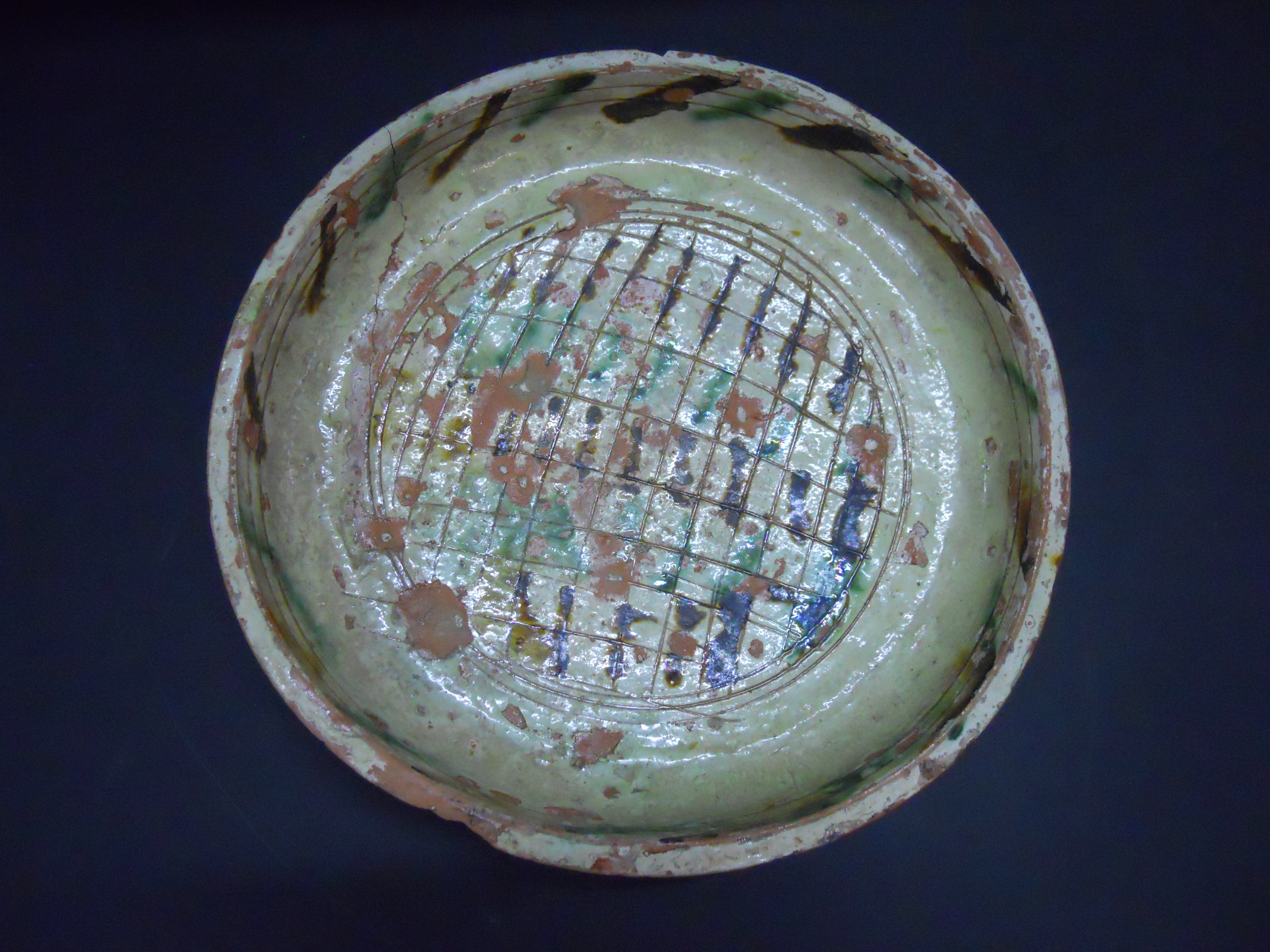 Πήλινο, εφυαλωμένο πινάκιο. Φέρει εγχάρακτο και γραπτό διάκοσμο. Στον πυθμένα εντός μεταλλίου αποδίδεται άβακας.