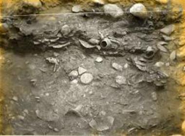 The fill of the deposit pit: Depth circa 0,20 m from the ancient niveau. (EN)
