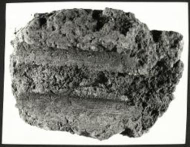 Τεμάχιον πηλού με ίχνη καλάμων εκ της επαλείψεως της στέγης προϊστορικής οικίας.