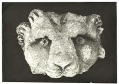 Ξενοδοχείο «Ήλιος». Λεοντοκεφαλή εκ των κονιαμάτων της επιχώσεως του βορειοτέρου υπογείου συγκροτήματος.