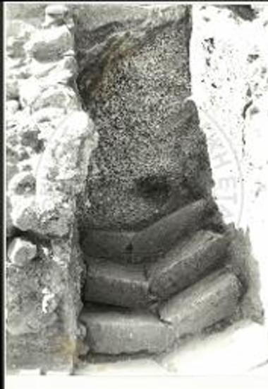Τομέας Δ, κλιμακοστάσιο εισόδου στο Δ5. Το πρώτο σκέλος όπως βρέθηκε μέσα στην επίχωση ελαφρόπετρας (Thera IV, πίν. 14α).