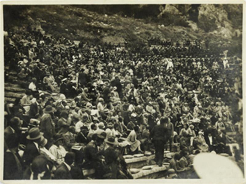 Το Αρχαίο θέατρο των Δελφών λίγο πριν αρχίσει η παράσταση "Προμηθέας Δεσμώτης". Α΄Δελφικές Γιορτές, 1927