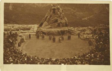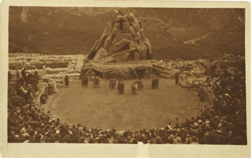 Ο Προμηθέας, καρφωμένος στην κορυφή του Καυκάσου 1927. "Προμηθέας Δεσμώτης" του Αισχύλου. Αρχαίο Θέατρο Δελφών. Α΄Δελφικές Εορτές, 1927
