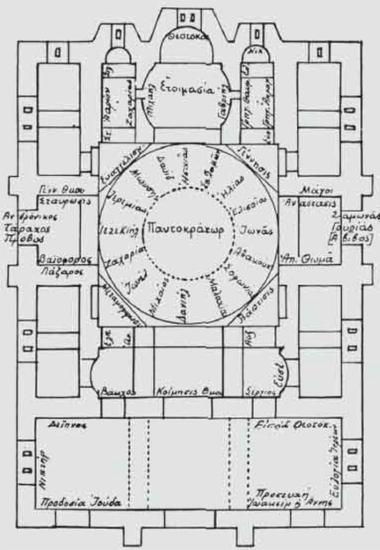 Άποψη του καθολικού της μονής Δαφνίου, όπου σημειώνεται το εικονογραφικό πρόγραμμα (Μεσαιωνικά Μνημεία της πεδιάδας των Αθηνών και των κλιτύων Υμηττού-Πεντελικού, Πάρνηθος και Αιγάλεω, σελ. 221). (EL)
