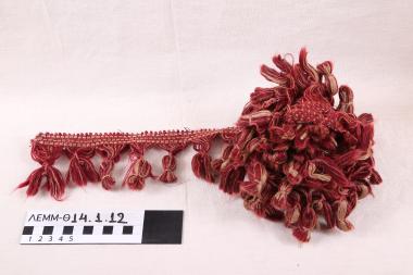 Δαντέλα - δαντέλα με κρόσσια από μπεζ και μπορντώ κλωστή. Χρησιμοποιήθηκε ως γύρος σε τραπεζομάντηλο
