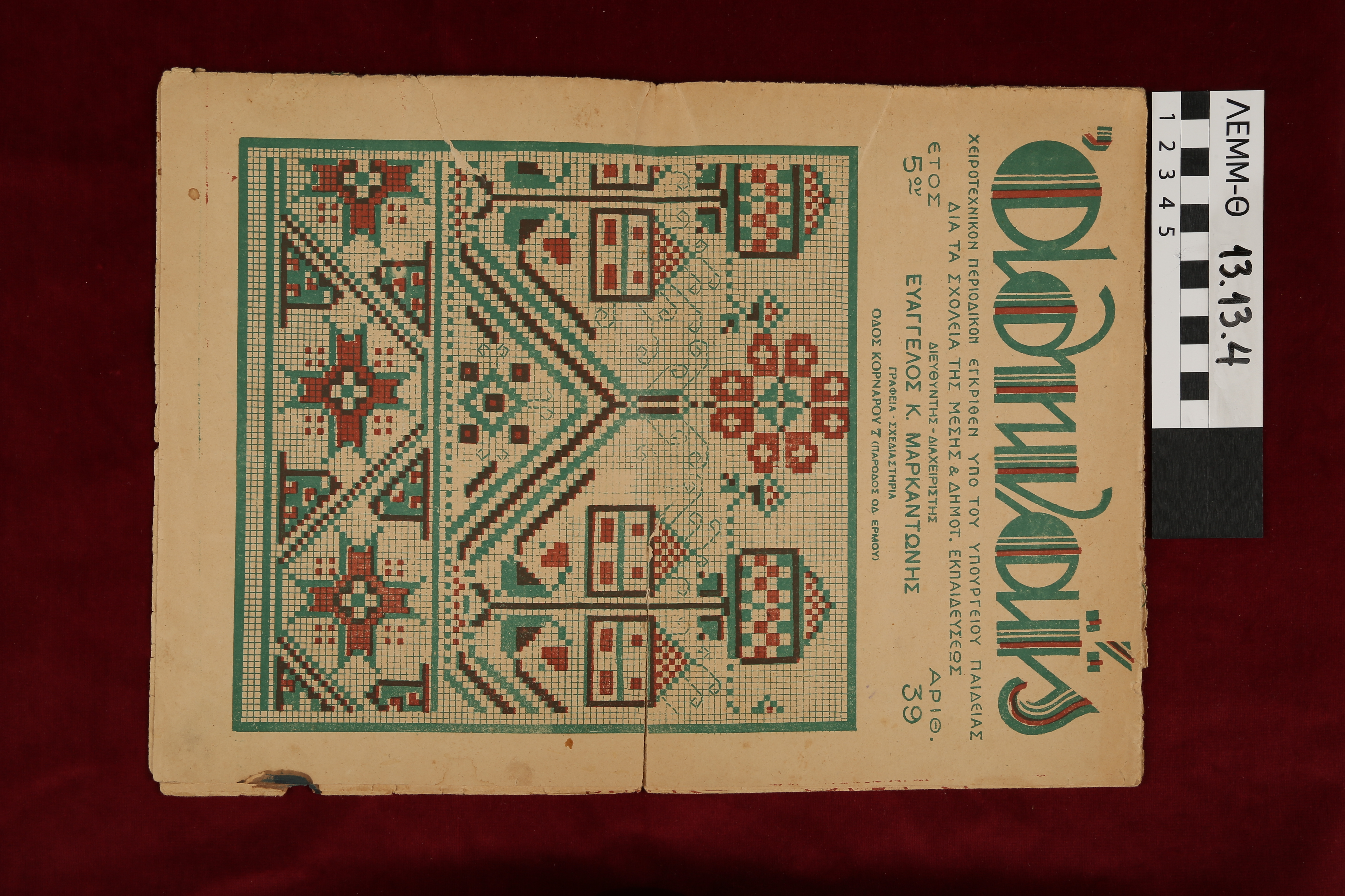 Περιοδικό - χειροτεχνικό τεύχος "Αθηναΐς" με πατρόν για εργόχειρα. Για τα σχολεία της μέσης και δημοτικής εκπαίδευσης. Έτος 5ον. Αριθ. 39. Πρώτο μισό 20ου αιώνα