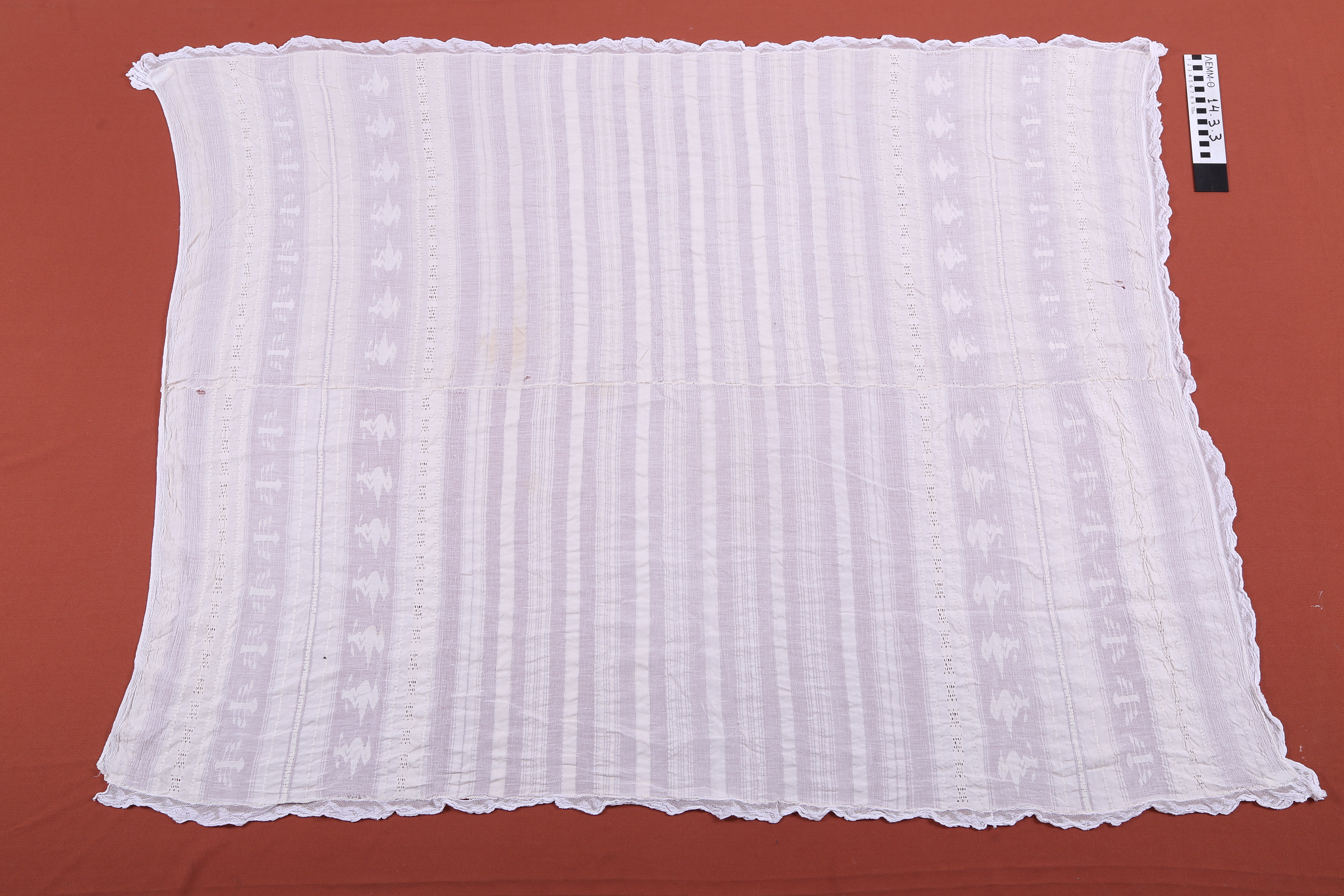 Σεντόνι - σεντόνι μεταξωτό υφαντό ουγιωτό, μπεζ-εκρού με διακόσμηση από αζούρ, ενυφασμένο μοτίβο πάπιας και δαντέλα