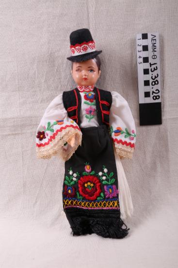 κούκλα υφασμάτινη με κεφάλι πλαστικό με επιχρωματισμένα τα χαρακτηριστικά και τα μαλλιά. Φέρει παραδοσιακή φορεσιά Ανατολικής Ρωμυλίας: Φούστα λινή υπόλευκη, πλισέ, ραμμένη μεταξύ των ποδιών, ποδιά βαμβακερή μαύρη με μαύρα κρόσσια και χειροποίητο πολύχρωμο κέντημα με ανθικά μοτίβα με βελονιές φουσκωτή απανωτή και αλυσιδοβελονιά, γιλέκο μάλλινο μαύρο με κόκκινα σιρίτια, πουκάμισο βαμβακερό λευκό με πολύχρωμο κέντημα στην ταχιλιά και τα μανίκια με ανθικά μοτίβα με φουσκωτή απανωτή βελονιά, τρέσα κόκκινη στα μ