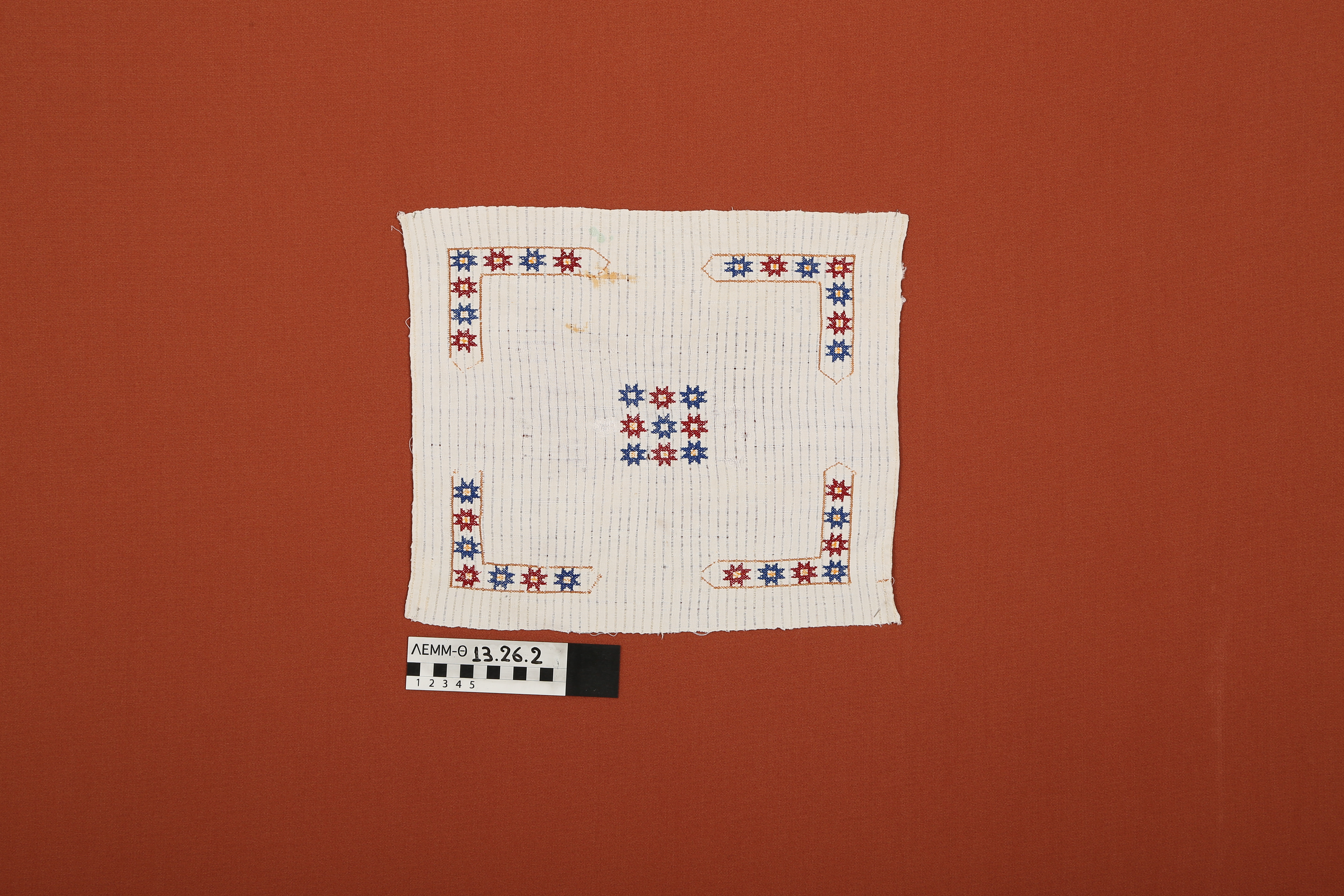 κέντημα σε υφαντό βαμβακερό υπόλευκο με ούγιες, με αστεροειδή μοτίβα από σταυροβελονιά, σε μπλε, μπορντώ και καφέ χρώμα. Παρατηρούνται καφέ και πράσινες κηλίδες