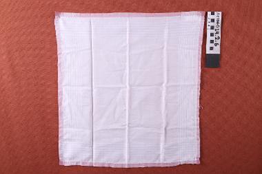 μαντήλι ανδρικό χειρός βαμβακερό, λευκό με βυσσινί περίμετρο και ταινίες πυκνότερης ύφανσης λευκές και γκρίζες που τέμνονται σχηματίζοντας πλαίσιο κοντά στην περίμετρο του υφάσματος. Η περίμετρος είναι φθαρμένη