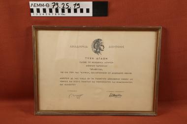 Πιστοποιητικό - βραβείο από την Ακαδημία Αθηνών προς την Αθηνά Ταρσούλη, σε ξύλινη κορνίζα