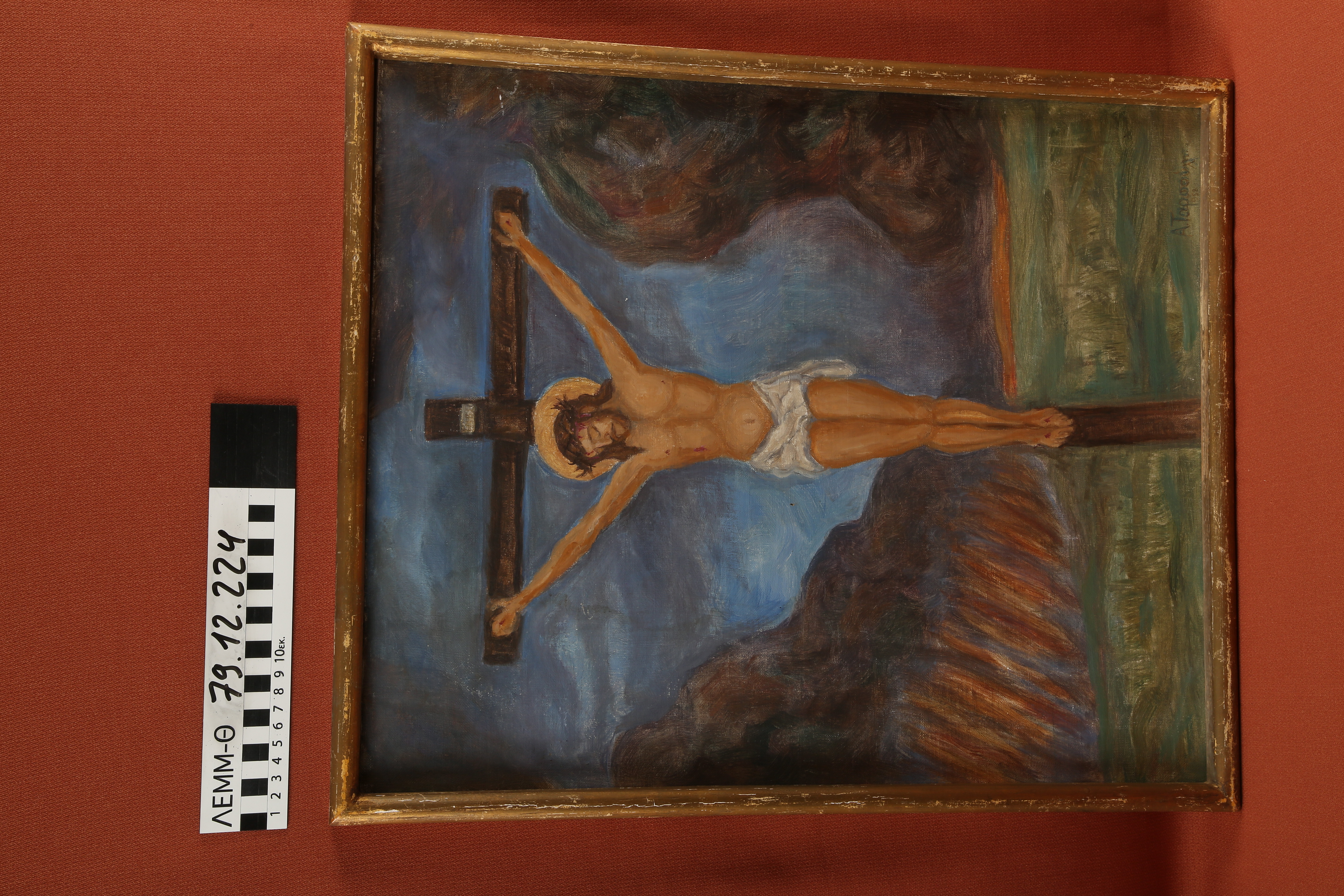 Πίνακας - πίνακας ζωγραφικής με τον Ιησού Εσταυρωμένο, με υπογραφή της Αθηνάς Ταρσούλη. Σε ξύλινη κορνίζα