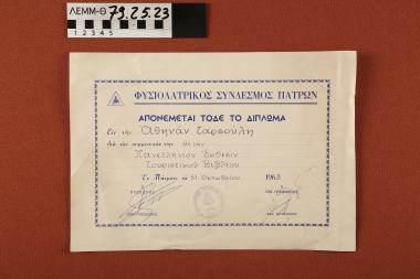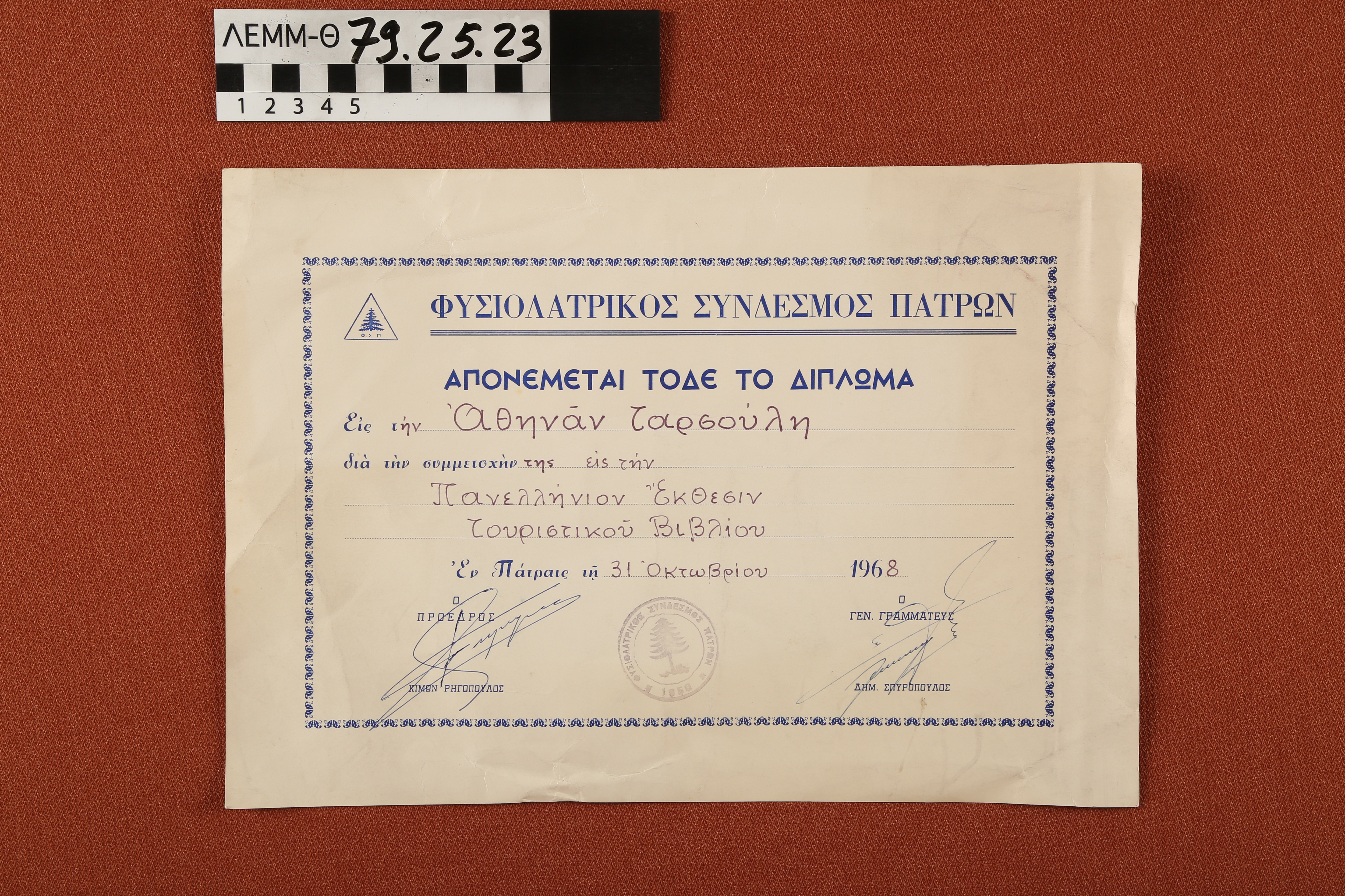 Πιστοποιητικό - δίπλωμα του Φυσιολατρικού Συνδέσμου Πατρών προς την Αθηνά Ταρσούλη για τη συμμετοχή της στην Πανελλήνια Έκθεση Τουριστικού Βιβλίου