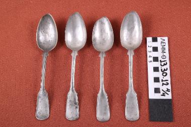κουτάλια βαθιά (σετ) μεταλλικά, πιθανόν επάργυρα, με διακοσμητικό ανάγλυφο πλαίσιο στη λαβή. Στην κάτω όψη της λαβής φέρουν εμπίεστη επιγραφή "PF G" που συνοδεύεται από δύο μικρά άστρα.Η καμπύλη του άκρου του κοίλου τμήματος των κουταλιών διακόπτεται στην αριστερή πλευρά από ένα τμήμα περίπου 1.5εκ, το οποίο είναι ευθύ. Παρατηρείται κατά τόπους αποχρωματισμός