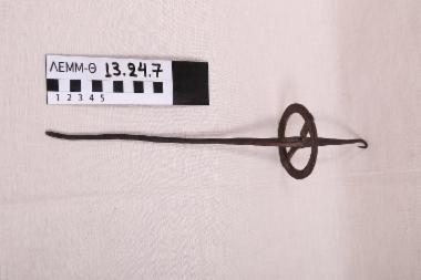 αδράχτι σιδερένιο με κυκλικό πλαίσιο προσαρμοσμένο στον κορμό και γάντζο στο κάτω άκρο. Παρατηρούνται οξειδώσεις (EL)