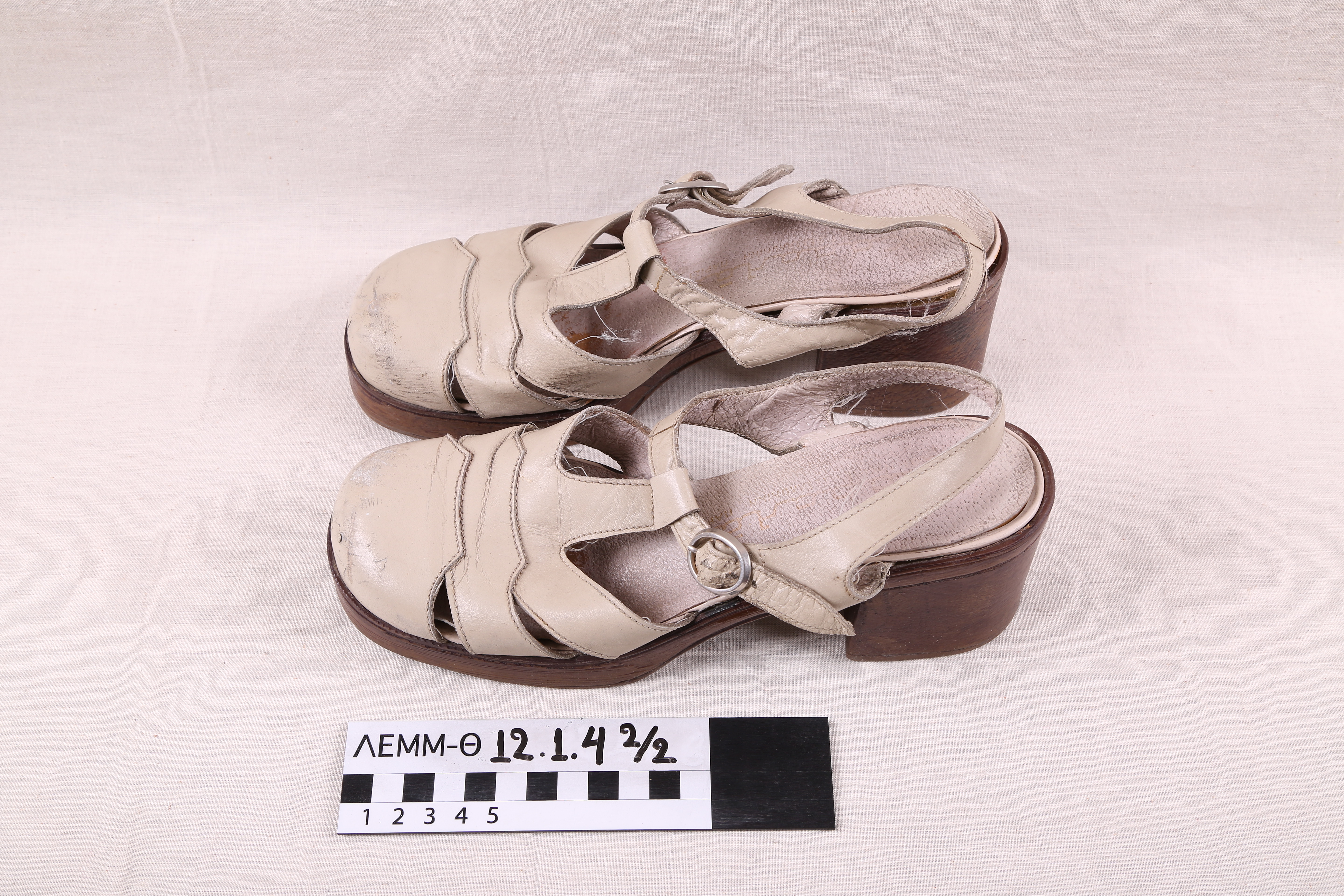 Παπούτσια (ζεύγος) - πέδιλα γυναικεία (ζεύγος) δερμάτινα με φαρδύ μέτριο τακούνι και μπαρέτα στον αστράγαλο, σε μπεζ-εκρού χρώμα