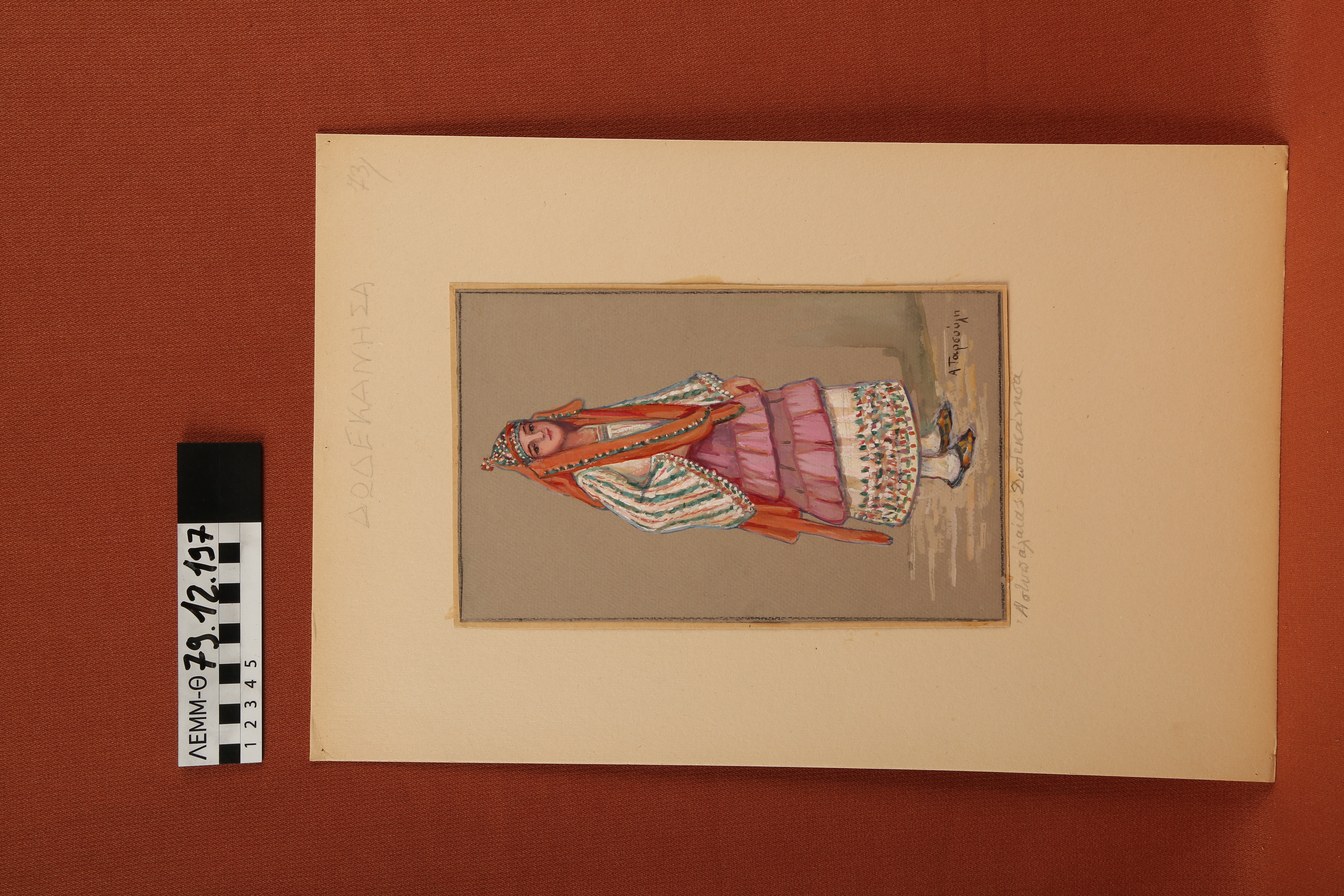 Σχέδιο - σχέδιο χειροποίητο με υδροχρώματα σε χαρτόνι. Απεικονίζει γυναίκα με παραδοσιακή φορεσιά της Αστυπάλαιας