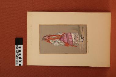 σχέδιο χειροποίητο σε χαρτόνι γκρι με υδροχρώματα, κυρίως, βυσσινί, κεραμιδί, πράσινο, λευκό. Απεικονίζει γυναίκα με παραδοσιακή φορεσιά της Αστυπάλαιας. Φέρει υπογραφή "Α. Ταρσούλη" με υδρόχρωμα μαύρο στην κάτω δεξιά γωνία. Το χαρτόνι είναι επικολλημένο σε χαρτόνι μπεζ-εκρού, το οποίο φέρει κάτω από το σχέδιο επιγραφή με μολύβι "Αστυπαλαίας Δωδεκάνησα" και στην επάνω στενή πλευρά "ΔΩΔΕΚΑΝΗΣΑ", "73". Στην πίσω όψη, στην επάνω στενή πλευρά φέρει θηλυκάκι για την ανάρτηση της θήκης. Προέρχεται από σύνολο σχεδ