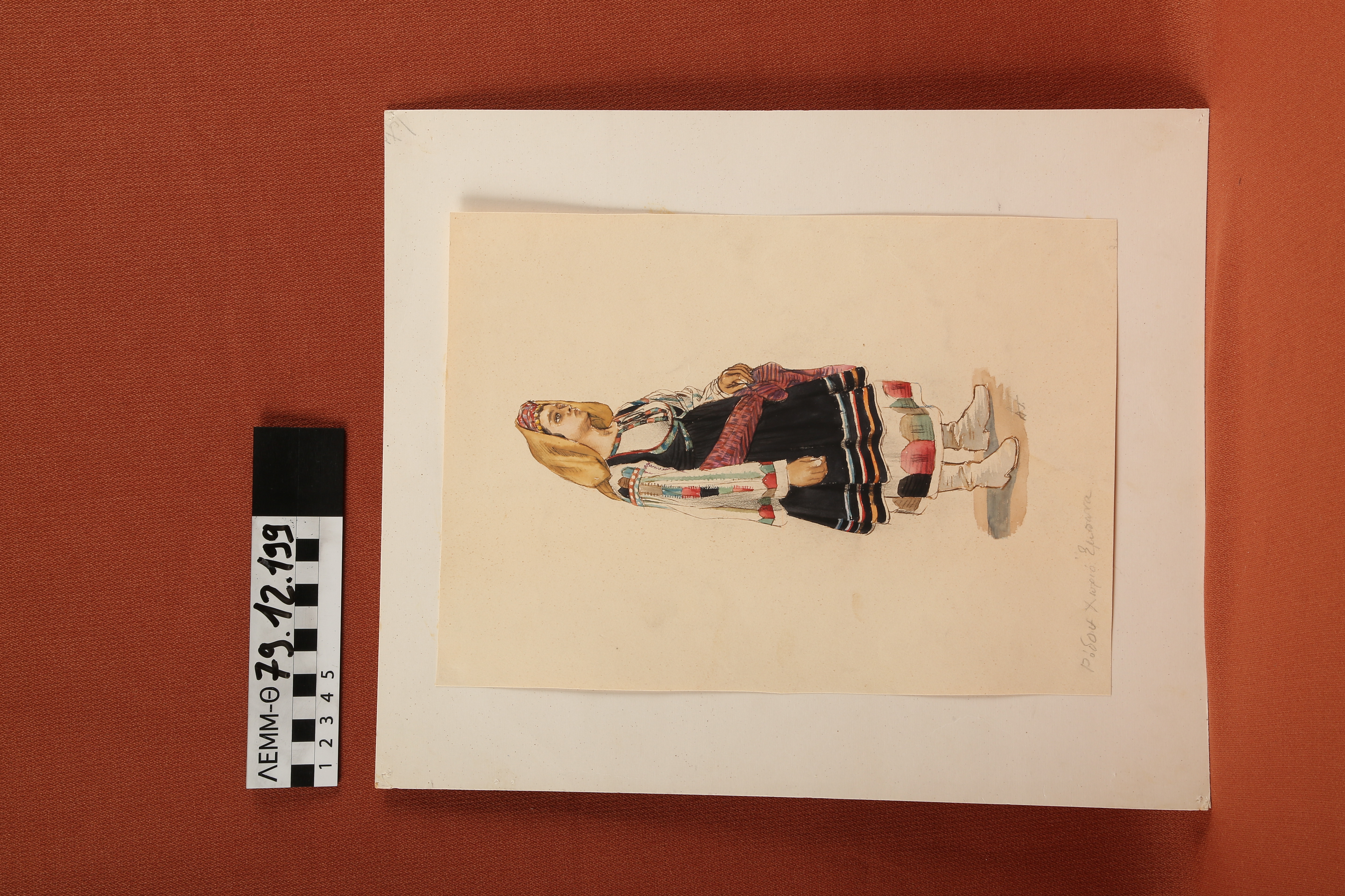 Σχέδιο - σχέδιο χειροποίητο με υδροχρώματα σε χαρτόνι. Απεικονίζει γυναίκα με παραδοσιακή φορεσιά του Έμπωνα Ρόδου
