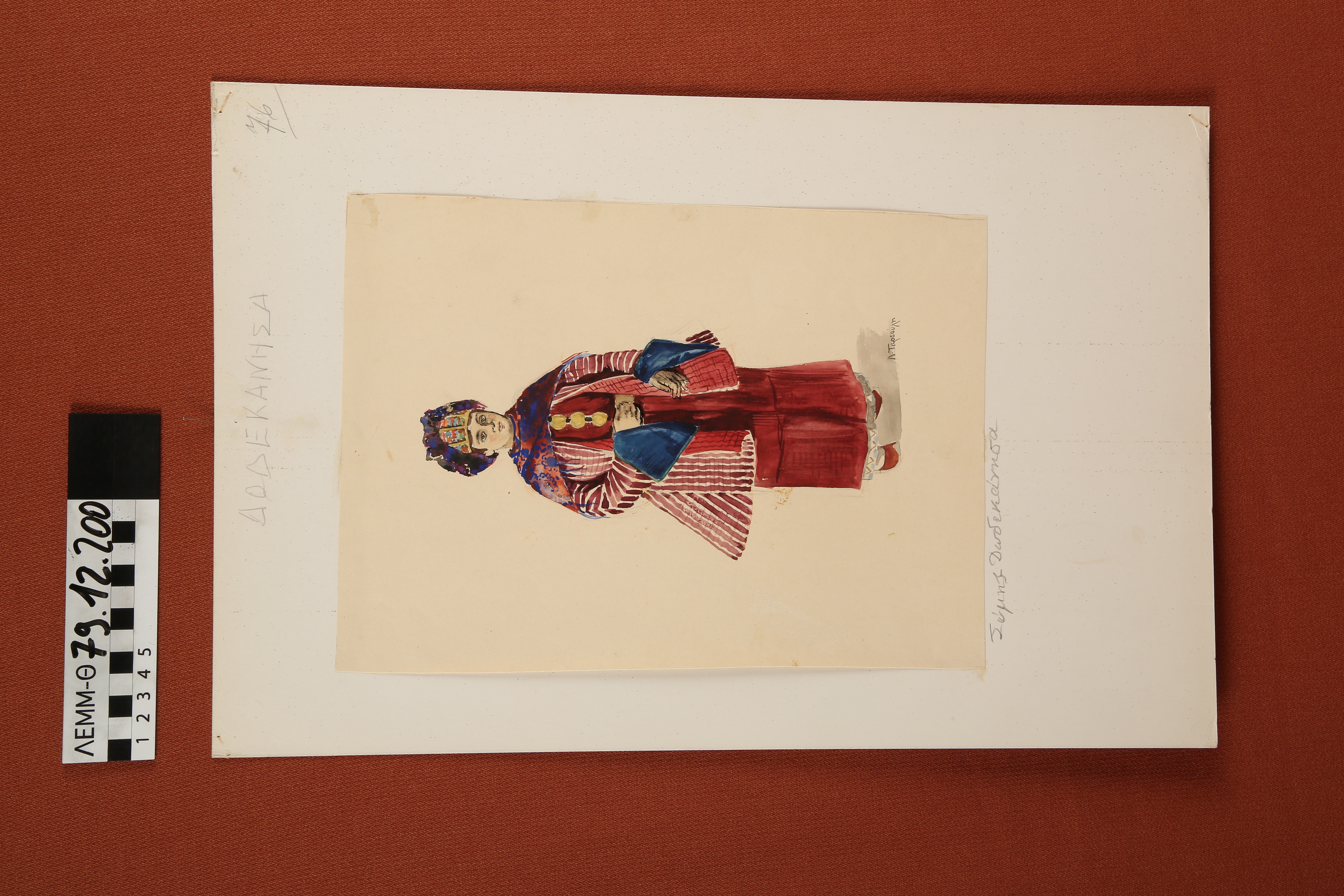 Σχέδιο - σχέδιο χειροποίητο με υδροχρώματα και σινική μελάνη σε χαρτόνι. Απεικονίζει γυναίκα με παραδοσιακή φορεσιά της Σύμης Δωδεκανήσων