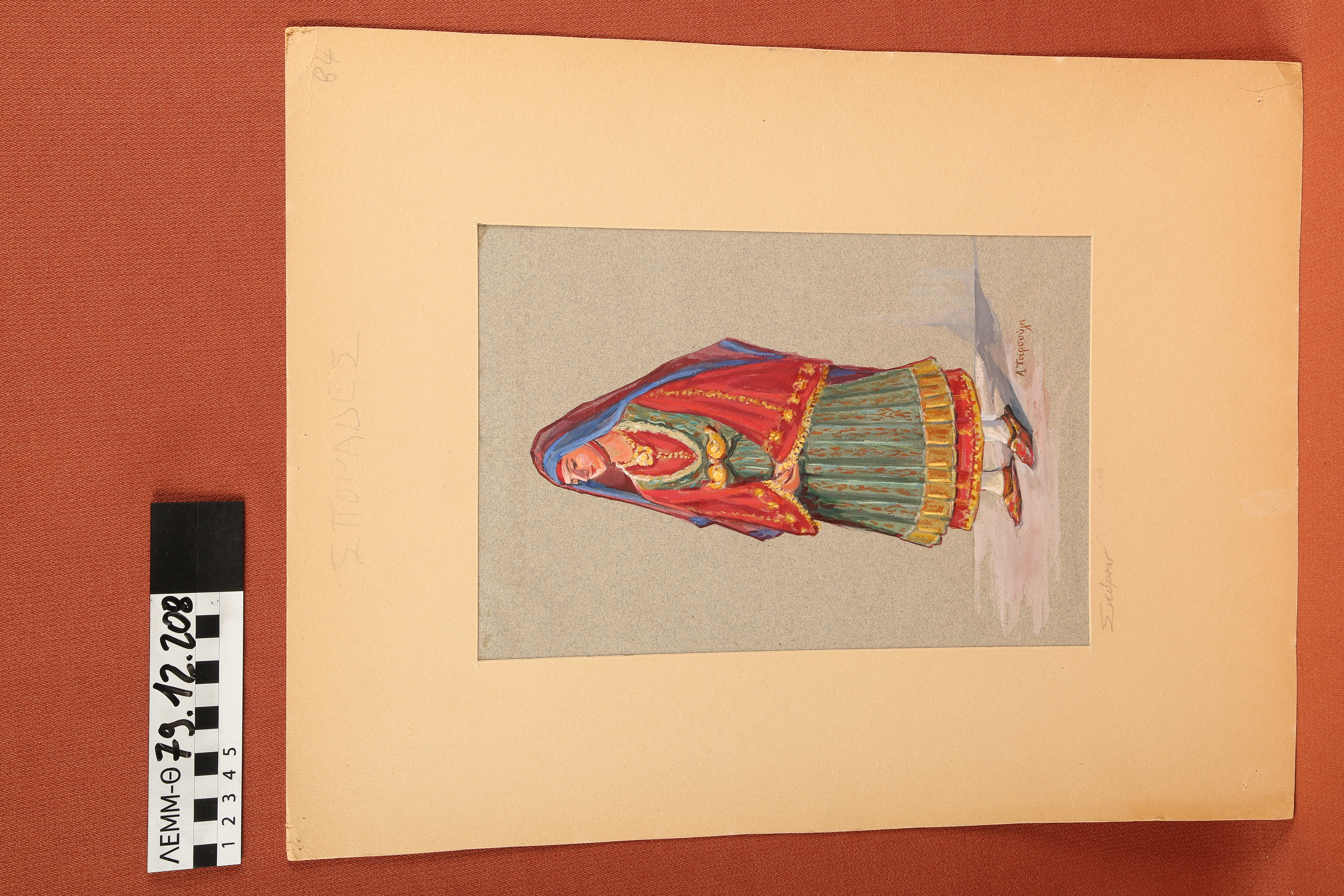 Σχέδιο - σχέδιο χειροποίητο με υδροχρώματα σε χαρτόνι. Απεικονίζει γυναίκα με παραδοσιακή φορεσιά της Σκύρου