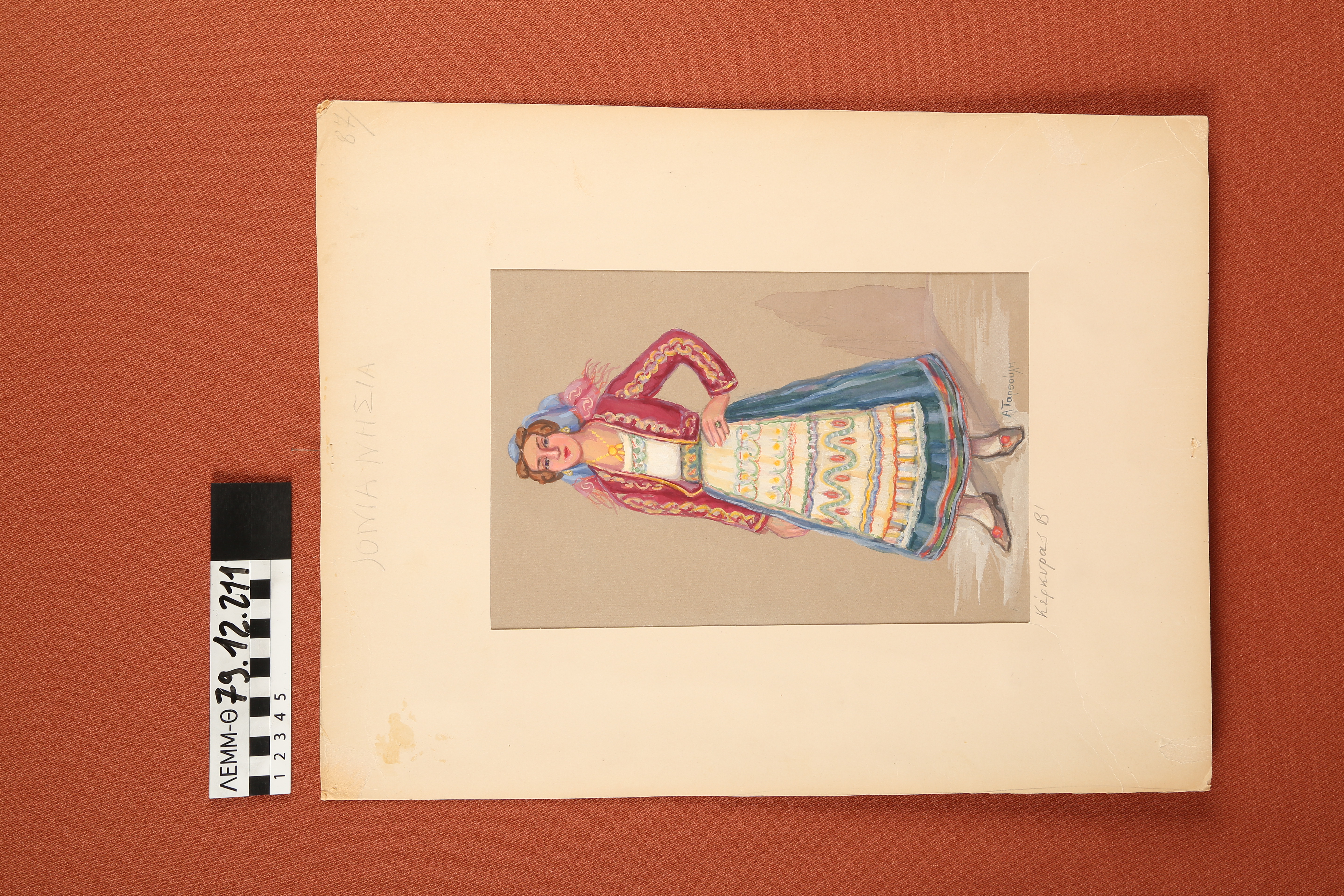 Σχέδιο - σχέδιο χειροποίητο με υδροχρώματα σε χαρτόνι. Απεικονίζει γυναίκα με παραδοσιακή φορεσιά της Κέρκυρας