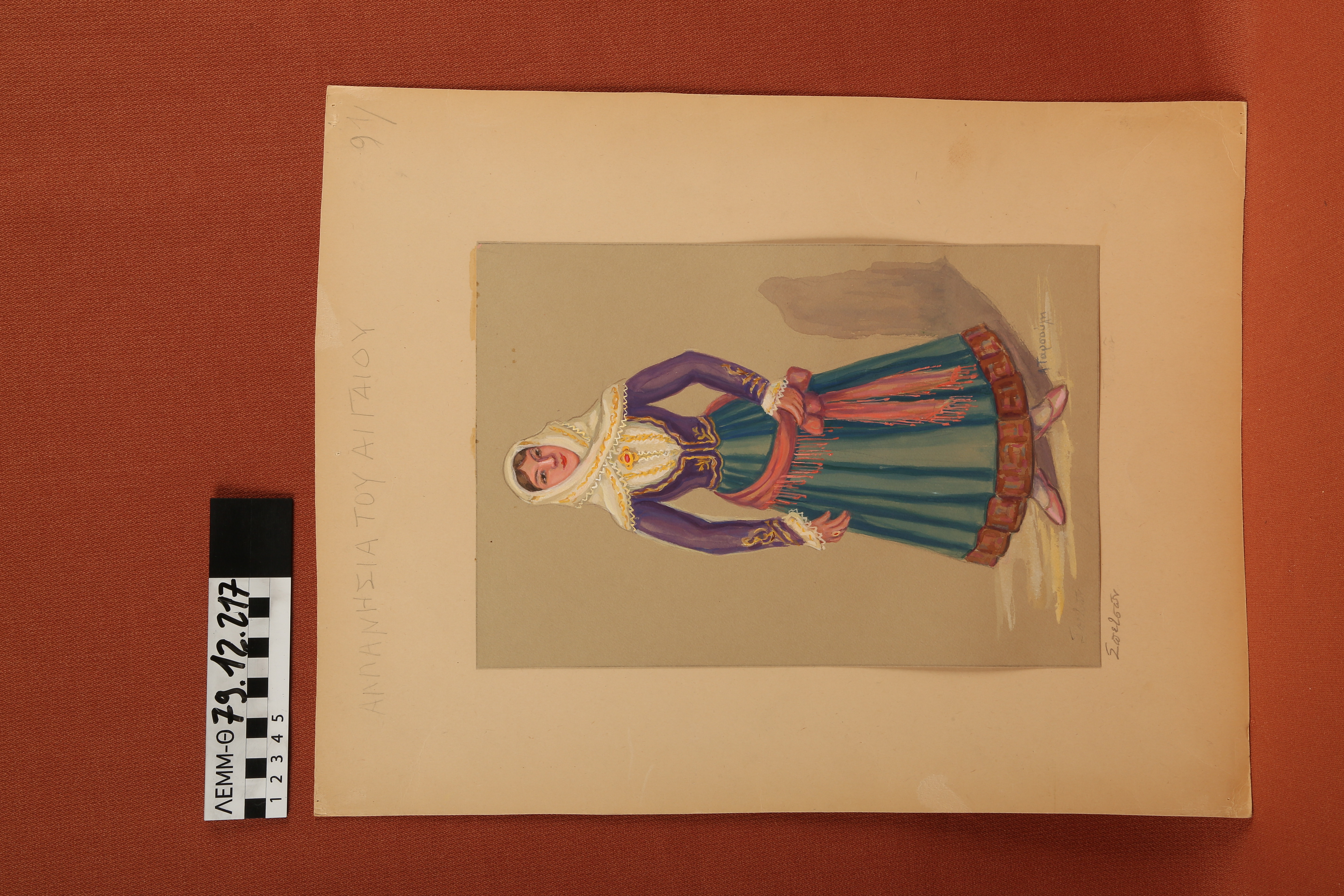 Σχέδιο - σχέδιο χειροποίητο με υδροχρώματα σε χαρτόνι. Απεικονίζει γυναίκα με παραδοσιακή φορεσιά Σπετσών